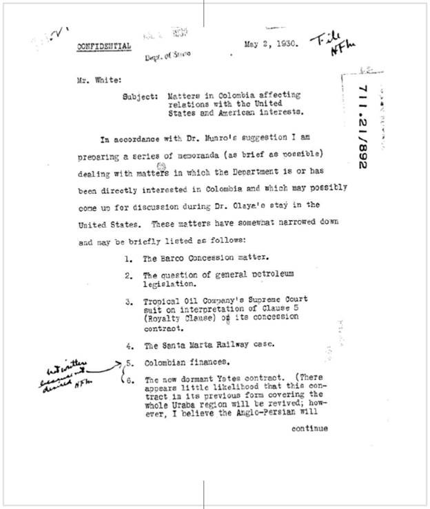 Figuraba allí todo lo atinente a la Concesión Barco, como primer punto, ligado a la necesidad de una legislación petrolera favorable a los intereses estadounidenses, tal como el propio embajador lo había insinuado en su encuentro personal con Olaya Herrera. El tercer aspecto era la resolución en la Corte Suprema de la demanda interpuesta por la Tropical Oil Company con respecto a la cláusula de regalías en su contrato de concesión, seguida por las "cuestiones" del ferrocarril de Santa Marta, las finanzas colombianas, la firma del contrato Dormán Yates con la posibilidad de cubrir toda la región de Urabá sin participación de la competencia anglo-persa, la eliminación de cualquier tipo de monopolio aéreo por parte de la Scadta, y resolver a favor de las compañías estadounidenses la exploración en Bocas de Ceniza. "Son solo esas materias", dijo el embajador en su escrito, "porque todo se ha venido resolviendo".38
