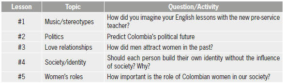 Students' written production. Students developed a written activity per session (Annex 3). These exercises promoted reflections about culture, music and social issues. One question/topic discussed in class was addressed. These reflections were written on paper and delivered to author two. Five activities were developed, and in the last session, students presented their own songs.