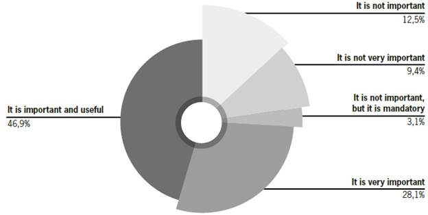 Culture and language learning. Data revealed how students recognized the importance of culture in EFL. In the survey, students were asked about this topic (Figure 1) and their answers showed that most of them (75%) saw culture as useful and important (46,9%) or very important (28,1%); opposed to those who think that culture is not important (12,5%), not very important (9,4%) or that despite not being very relevant it is mandatory (3,1%). These opinions mean that despite certain opposition to the ID in LL, this research enhanced the students' experience with different cultures through the use of music and showed the need of integrating other cultures in LL. Stressing the importance of the ID in ELT is a step ahead towards a deeper comprehension of the world, better integration with the sociocultural reality and development of critical skills (Fernández, 2019; Quintana-Arias & Bello-Serna, 2020; Wagner & Byram, 2017). Therefore, discovering that most students understand the relevance of culture in LL is necessary to develop intercultural skills and create ways for intercultural communication.