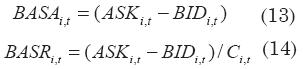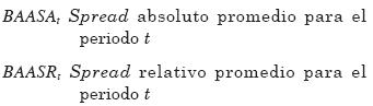 El Bid-Ask Spread Absoluto (BASA) consiste en la diferencia entre el precio de compra Bid y el precio de venta Ask; el Bid-Ask Spread Relativo (BASR) resulta de esta diferencia, dividida entre el precio de cierre: