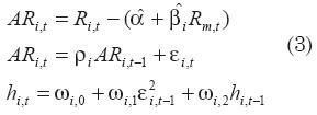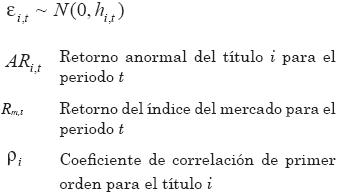 Una forma de corregir la posible heteroscedasticidad y autocorrelación serial en los retornos anormales, es usar el modelo autorregresivo con heteroscedasticidad condicionada (GARCH), el cual modela la varianza de los retornos anormales. Este modelo se escribe como: