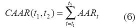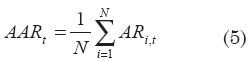 Considérese la agregación entre varios títulos y eventos para un intervalo dentro de la ventana del evento t1. Lo primero que se debe hacer es agregar los retornos anormales de los títulos individuales considerando N eventos. El retorno anormal promedio (Average Abnormal Return-AAR) para el periodo t es igual a: