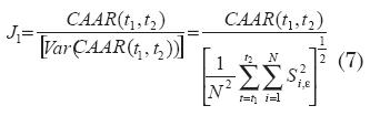 En la primera prueba paramétrica se busca determinar si el retorno anormal acumulado promedio difi ere de cero para el intervalo comprendido por la ventana del evento (MacKinlay, 1997). Esta prueba, llamada J 1 , es conveniente cuando se considera que los retornos anormales acumulados varían entre los diferentes títulos. La varianza de los retornos anormales promedio acumulados asume que las ventanas del evento no se traslapan entre los títulos, de manera que se evita la correlación entre los rendimientos anormales de los títulos. Así, para verificar la hipótesis nula de que los retornos anormales promedio acumulados son nulos, se utiliza esta prueba estadística (MacKinlay, 1997):