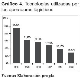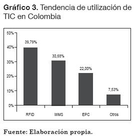En otro estudio (GS1 Colombia, 2006), los investigadores aplicaron una encuesta basada en una muestra de 21 operadores logísticos del país. De ese estudio se observó (ver Gráfico 4) que las TIC que más se utilizaban para la gestión de almacenes fueron el WMS con un 61,90% y la RFID con 57,10%. Por otra parte, la implementación de sistemas ERP se encuentra por debajo del WMS debido a que los operadores logísticos tienden a ser empresas especializadas en la gestión de almacenes y las funciones de este tipo de TIC suelen ser genéricas e incluir pocas herramientas de planeación y análisis logístico.
