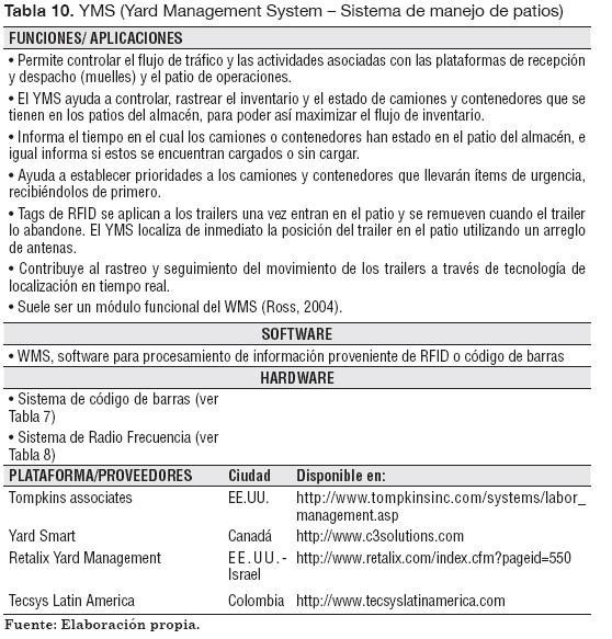 En la Tabla 10 se presenta información de las principales aplicaciones, sistemas de hardware, software y proveedores de esta tecnología a nivel internacional (debido que en Colombia este sistema no ha alcanzado alto grado de utilización), tomada de Gattorna, Ogulin y Reynolds (2003), Tompkins y Harmenlink (2004), Ross (2004), e instituciones como Tompkins Associates (2008).