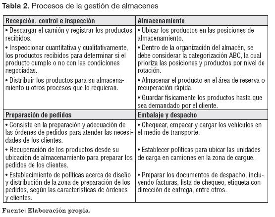 En la Tabla 2 se observa que existen diferentes procesos que configuran la gestión de almacenes, por lo cual, para cada empresa se debe analizar cuáles y cómo utilizarlos con el fin de garantizar un adecuado uso de los recursos y capacidades del almacén.