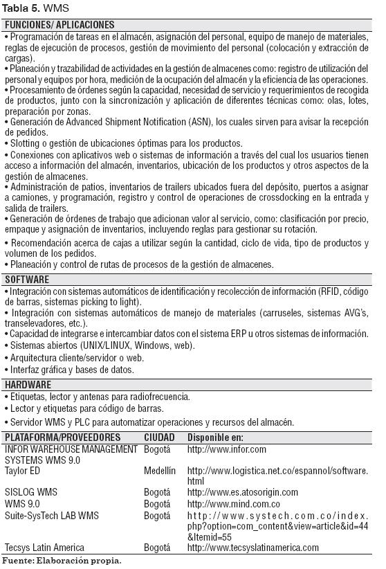 Es una TIC que apoya la planeación, ejecución y control de sus procesos, desde la recepción pasando por su acomodo, almacenamiento y preparación de pedidos hasta su despacho. Adicionalmente, considera la gestión de sus recursos, tales como equipo de manejo de materiales, personal y costos. En la Tabla 5 se revisan algunas funcionalidades, software, hardware y proveedores, tomados de Tompkins y Smith (1998), Ballou (2004), Mentzer (2001), Tompkins y Harmenlink (2004) y Plenert (2007).