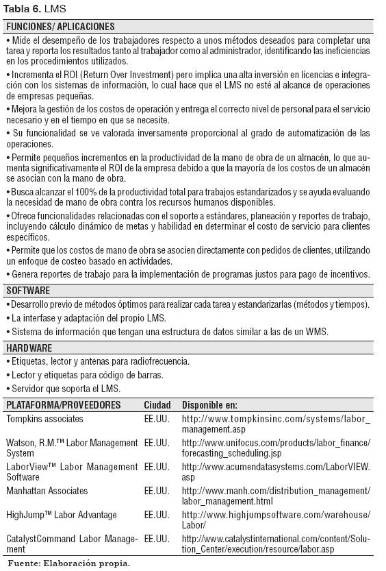 En la Tabla 6 se identificó que el LMS se enfoca en mejorar la productividad del almacén a través de la adecuada programación, seguimiento y control del personal y recursos que participan en sus actividades. Adicionalmente se observó que sus funcionalidades en algunas ocasiones son incluidas en sistemas WMS robustos, como es el caso de Tecsys Latin America en Colombia que ofrece el WMS y LMS dentro del mismo software. Cabe destacar que la mayoría de proveedores identificados de esta tecnología se ubican en los Estados Unidos.