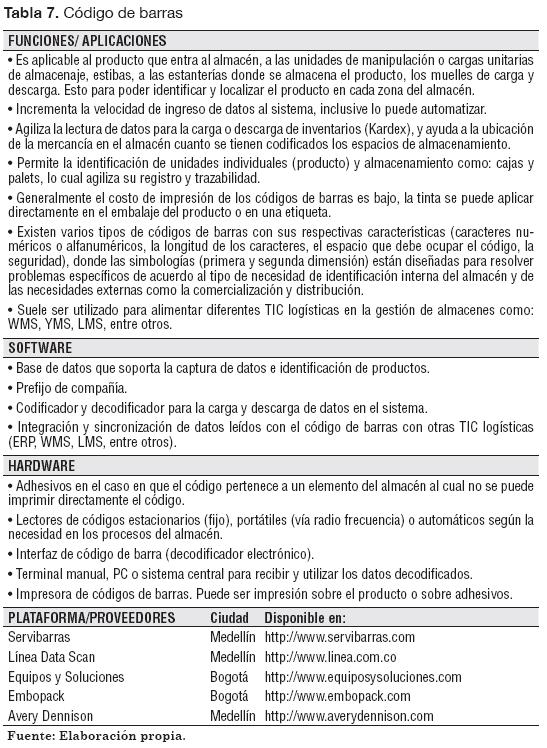 Es una tecnología que permite capturar datos e identificar productos y unidades de cargas, los cuales son manipulados a través de los diferentes procesos de la gestión de almacenes. En la Tabla 7 se revisan algunas de sus funcionalidades, software, hardware y proveedores los cuales, fueron tomados de Monsoi (1994), Tompkins y Smith (1998), Berenguer y Ramos (2003), Frazelle y Rojo (2006), Gourdin (2006), Mauleón (2006), Jones y Cheng (2007) y GS1 Colombia (2008).