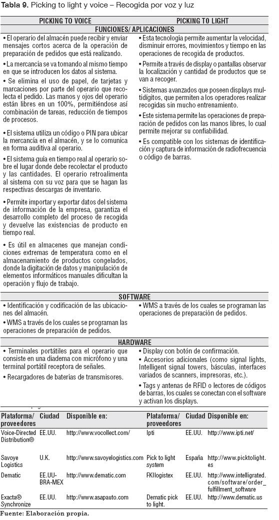 Son TIC que apoyan la ejecución del proceso de preparación de pedidos eliminando el uso de papeles y sincronización con otras tecnologías como el WMS, LMS o YMS, para mejorar la eficiencia y eficacia en la gestión de almacenes. En la Tabla 9 se revisan algunas de sus funcionalidades, software, hardware y proveedores, los cuales, fueron tomados de Tompkins y Harmenlink (2004), Frazelle y Rojo (2006), Novak (2006), Urzelai (2006) y Working Machines (2008).