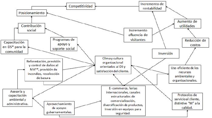 La figura 3 representa el mapa de las operaciones establecidas por Canopy River que manifiesta de forma general la estrategia que sustenta su naturaleza empresarial. Todas las acciones formuladas, que integran asesorías, capacitación, gestión de recursos gubernamentales, ferias, e-commerce, diversificación de servicios, inversión en equipo, certificaciones y protocolos, han sido orientados al uso eficiente de los recursos, tanto ambientales como organizacionales, y a la contribución social, teniendo como eje una cultura y clima organizacional capaz de controlar ingresos, costos y gastos con los beneficios que genera un posicionamiento de la imagen que la organización ha proyectado de servicio y sustentabilidad, contribuyendo con el incremento sustancial y sostenido de la afluencia de visitantes, utilidades y rentabilidad, favoreciendo así su competitividad.