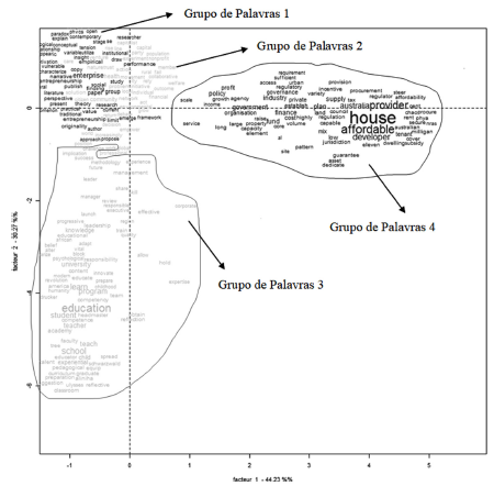 Para a análise da figura 1, considera-se o quadrante em que o grupo se encontra, bem como as possibilidades que são traçadas pela intersecção. Também é possível observar o motivo pelo qual o grupo de palavras 1 (estudos em ES) e o grupo de palavras 2 (sociedade) se encontram mais próximos e, em alguns momentos, misturados; e o porquê do grupo de palavras 3 (educação) e do grupo de palavras 4 (políticas de habitação) estarem mais distantes, porém, com palavras interligadas. Estudos em ES (grupo de palavras 1) estão misturados com sociedade (grupo de pala vras 2) no centro da discussão. Nas periferias, tem-se as discussões que permeiam a educação (grupo de palavras 3), com alguns elementos próximos ao núcleo central da discussão; do outro lado, as políticas de habitação (grupo de palavras 4). O grupo que representa educação, diz respeito aos artigos sobre a formação para empreendedores sociais, pesquisas sobre eles e seus empreendimentos, métodos, conceitos, definições, entre outros aspectos. Há algumas interpretações, a exemplo de um artigo que trata o professor como um empreendedor social (Chand e Misra, 2009), mas em geral os artigos procuram disseminar o ES por meio da educação. Nas discussões sociais, comumente, surge o aspecto habitação, que é uma preocupação vá lida tendo em vista que faz parte de uma necessidade primária do ser humano (Ferreira, 2004). Por se tratar de uma preocupação social, é certo que alguns empreendedores sociais se dediquem à habitação, leis e regulamentos, políticas públicas para habitação, acesso, incentivo, planeja mento e desenvolvimento.