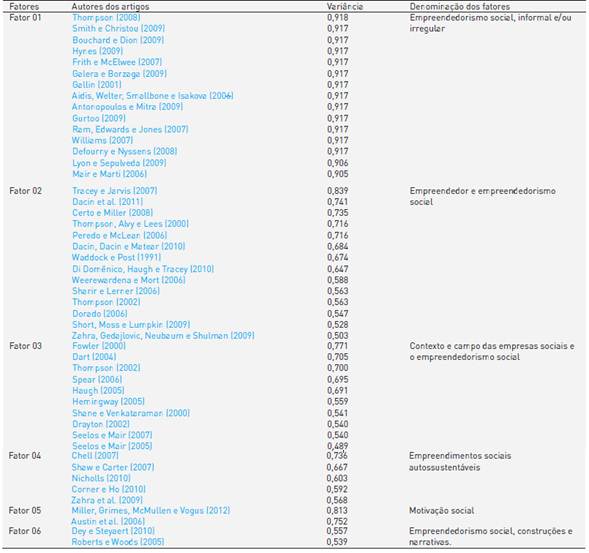 O resultado da AFE apresentou total da variância explicada de 75,42%, KMO > 0,6 e Teste de esfericidade de Bartlett < 0,05, resultados considerados adequados (Hair et al., 2010). A tabela 2 apresenta o resumo da AFE, já com os componentes separados por fator, com autores e ano da publicação. A partir desse agrupamento, procurou-se analisar qualitativamente os padrões apresentados pela maioria dos resumos, métodos e conclusões de cada uma das publicações cocitadas. De um total de 54 artigos cocitados resultantes da AFE, seis foram ou excluídos da tabela ou mantidos em apenas um fator que melhor o representasse: Eisenhardt (1989); Bhide e Stevenson (1990); Leadbeater (1997); Wallace (1999); Mair e Marti (2006); Austin, Stevenson e Wei-Skillern (2006). As exclusões das cocitações aconteceram pela não identificação do artigo completo cocitado na base de dados, restando 48 artigos.