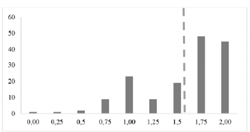 Nota: la barra punteada se ubica en el valor medio 1,559. La línea punteada corta en el promedio de la muestra. Fuente: elaboración propia.