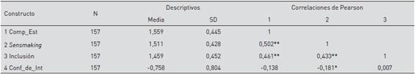 En la tabla 1 se presentan las estadísticas descriptivas de los constructos y resultados del análisis de correlación. En esta se destaca que la media y desviación estándar de las variables sensemaking y compromiso estratégico son similares, ya que la mayor parte de los encuestados contestó con valores positivos entre 1,5 y 2,0 (la escala es de -2 a 2). El coeficiente de correlación de Pearson en la relación de sensemaking e inclusión con compromiso estratégico fue significativa y prácticamente similar (r = 0,502; r= 0,461). En el caso de conflicto de intereses, la mayoría de los encuestados contestó con valores negativos entre -0,5 y -1,0 y fue la variable con una mayor desviación estándar (SD=0,804; casi el doble de las otras), y los valores de la correlación de Pearson del conflicto de intereses mantuvieron signo negativo en su relación con el compromiso estratégico, y en particular éste fue no significativo (r = -0,138).