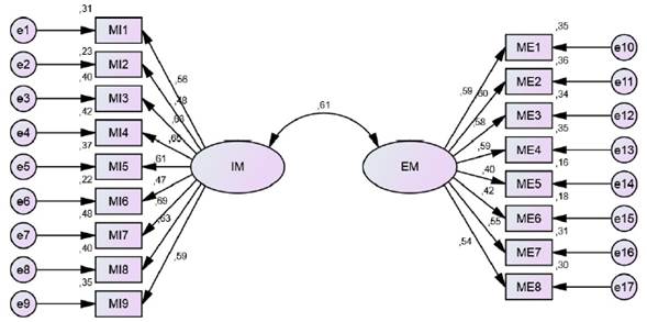 CFA was the technique used to define the convergent and discriminatory validity of the measures used. The result confirmed the division of the motivational scale into two factors (Figure 3), named Intrinsic Motivation (IM, with nine variables) and Extrinsic Motivation (EM, with eight variables). SEM was used to measure the fit of the model, presenting indices r²/df = 3.06, RMSA = 0.081, TLI = 0.901 and CFI = 0.928. These indices are within the acceptable range to consider fitting the model as appropriate.