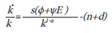 Efectuando los reemplazos correspondientes en (5), se deriva la siguiente ecuación de la tasa de crecimiento del capital físico per cápita en el tiempo: