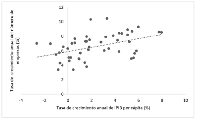 La importancia explicativa de la actividad empresarial para el crecimiento económico resalta no solo en los estudios a nivel de países, regiones y sectores económicos, sino también de las ciudades. Por ejemplo, Udih y Odibo (2016), en una investigación realizada para dos ciudades de Nigeria, encontraron que el aumento en la creación de empresas habría coadyuvado a elevar la tasa de crecimiento del PIB de ambas ciudades. Audretsch, Belitski y Desai (2015) también hallaron resultados similares en un estudio que comprendió a 127 ciudades europeas.