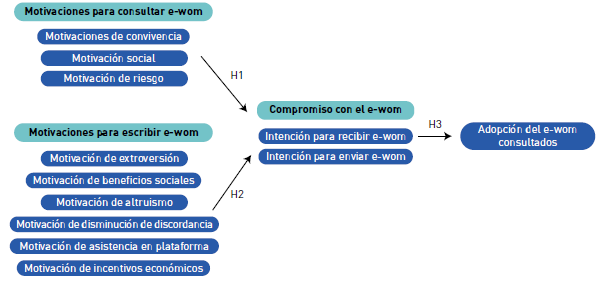 H1. Las motivaciones para consultar e-WOM influyen positivamente en el compromiso con el e-WOM.
