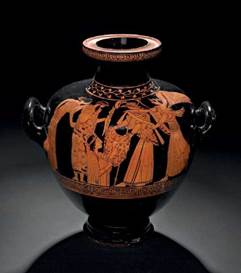 Figura 2 "Lebe gámico de terracota (cuenco de fondo redondo con manijas y soporte usado para matrimonios)", (ca. 420 a. C). Atribuida al pintor Naples. The Metropolitan Museum of Art. Web.