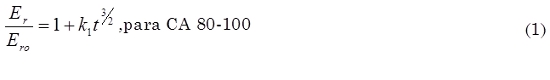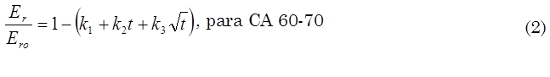 Estos resultados pueden ser expresados matemáticamente a través de (1) y (2) para las mezclas fabricadas con CA 80-100 y CA 60-70 respectivamente. Esta ecuación puede ser utilizada solamente para la mezcla analizada en el rango de tiempo evaluado (28-29 meses) ya que se debe prever un cambio del comportamiento de la misma a medida que aumente t. Las variables estado k1-k3son obtenidas a través de regresión y no presentan un significado físico definido (ver Tabla 5). En la Fig. 8 se presenta el ajuste de los ensayos ejecutados empleando (1) y (2) y el coeficiente de correlación es r2=0,79.