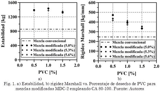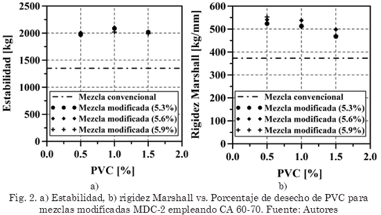 En general, las mezclas asfálticas modificadas con el desecho de PVC tienden a poseer un comportamiento rígido. A bajas temperaturas de servicio estas mezclas pueden tener un comportamiento frágil, llevando a pensar que tendrían un mejor desempeño en climas cálidos. Los valores de estabilidad y rigidez Marshall de las mezclas modificadas con CA 80-100 y CA 60-70 son mayores, para cualquier porcentaje de CA y PVC, en comparación con la mezcla convencional. El mejor comportamiento de las mezclas, con base en los ensayos de resistencia bajo carga monotónica, caracterización dinámica y viscosidad se presenta cuando se adiciona 0,7% de PVC (con respecto al peso total de la mezcla) al contenido óptimo de CA. Los módulos dinámicos de las mezclas modificadas con CA 80-100 son superiores a aquellos alcanzados por las convencionales, y los mayores incrementos se obtienen cuando la temperatura del ensayo aumenta. Lo anterior permite prever que el PVC como modificador de asfaltos puede ser un material que permita mejorar las características de rigidez y resistencia a las deformaciones permanentes de mezclas que sean utilizadas en climas cálidos. La resistencia que tienen los asfaltos modificados a fluir es mayor con respecto al convencional. Los valores de penetración del asfalto modificado permiten predecir menor ahuellamiento a altas temperaturas de servicio en comparación con los convencionales.