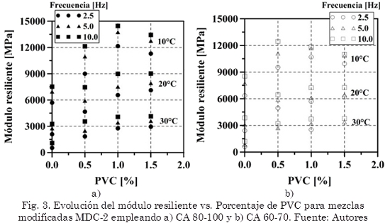 Con los resultados obtenidos del ensayo Marshall se determinó un porcentaje de cemento asfáltico y PVC con base principalmente en el máximo valor de la relación estabilidad – flujo E/F (llamada por algunos investigadores como rigidez Marshall; esta relación físicamente puede ser entendida como una resistencia mecánica evaluada en el estado de falla de las mezclas, bajo carga monotónica en un ensayo de tracción indirecta), el flujo, módulo resiliente y en los resultados de los ensayos de viscosidad. Con el valor de CA y PVC se fabricaron nuevas briquetas para realizar los ensayos de módulo resiliente (INV. E 749, INVIAS, 2007b) y resistencia a la deformación permanente de mezclas asfálticas (EN 12697-22, CEN, 2005). El módulo resiliente fue obtenido bajo tres temperaturas (10, 20 y 30°C) y frecuencias de carga diferentes (2,5; 5,0 y 10,0 Hz) utilizando un equipo Nottingham Asphalt Tester (NAT). Tres muestras y ensayos por temperatura y frecuencia de carga fueron ejecutados para medir el módulo resiliente. Las muestras para determinar el módulo fueron ensayadas bajo carga cíclica en tracción indirecta. El ensayo de resistencia a la deformación permanente bajo carga repetida fue realizado bajo un esfuerzo de 100 kPa y a 3600 ciclos de carga siguiendo el procedimiento normalizado por EN 12697-22 (CEN, 2005). Tres muestras fueron ensayadas por cada relación de PVC y CA para la ejecución del ensayo de deformación permanente.