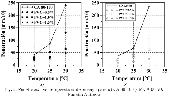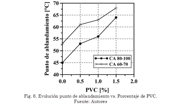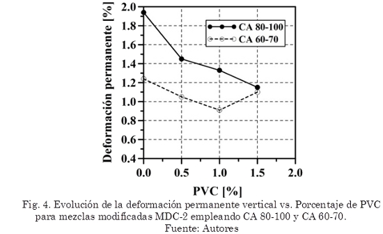 La deformación permanente disminuyó entre 25-41% (CA 80-100) y 11-27% (CA 60-70) cuando se adicionó PVC entre 0,5-3,5% respectivamente. Este aumento en rigidez y resistencia a la deformación permanente se debe a que con la incorporación del PVC al CA se obtiene un material más rígido y viscoso tal como se observa en las Fig. 5 y 6.