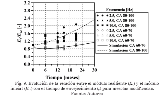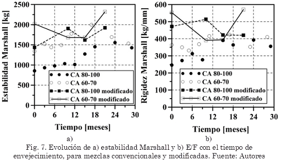 Para el caso de las mezclas modificadas, el comportamiento que experimentan es totalmente contrario al de las convencionales. En los primeros 15 meses de exposición al medio ambiente, las mezclas modificadas con CA 60-70 experimentan una disminución (entre 17 a 29%) en la resistencia bajo carga monotónica para luego incrementar hasta alcanzar valores similares e incluso superiores al de las mezclas sin envejecer. El decaimiento en la resistencia es debido a la generación de micro-fisuras que se producen a bajas temperaturas cuando las mezclas son rígidas (comportamiento frágil), luego estas micro-fisuras se estabilizan y el aumento en rigidez se debe a un fenómeno de envejecimiento y oxidación del asfalto. El fenómeno de micro-fisuración a bajas temperaturas ha sido ampliamente reportado por diversos investigadores (Kliewer et al., 1996; Sebaaly et al., 2002; Nesnas&Nunn, 2006). Las mezclas modificadas con CA 80-100 experimentan en 21 meses, un aumento en E de 34% y disminución en E/F de 11%.
