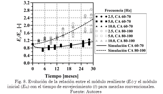 En las Fig. 8 y 9 se presenta la relación (Er/Ero) entre el módulo resiliente que se obtiene luego de someter las briquetas al ambiente durante distintos periodos de tiempo (Er) y el módulo resiliente inicial de las mezclas en un tiempo t=0 meses (Ero). Para el caso de las mezclas fabricadas con CA 80-100, el módulo alcanzado en t=29 meses aumenta entre un 64 y 185% (dependiendo de la temperatura y frecuencia del ensayo) con respecto al inicial, incrementando la resistencia a la deformación permanente (Fig. 8 y 10). Las mezclas con CA 60-70 experimentan una disminución máxima en su módulo de 35% en los primeros cinco meses de exposición, disminuyendo su resistencia a las deformaciones permanentes (ver Fig. 8 y 10). Luego el Er aumenta y experimenta en t=28 meses, valores que superan ligeramente el inicial, aumentando la resistencia a la deformación.
