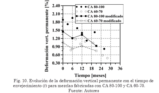 Las mezclas modificadas sometidas al medio ambiente de la ciudad de Bogotá D.C., fueron fabricadas utilizando la siguiente composición: 5,3% de CA 80-100 y 0,7% de PVC, y 5,6% de CA 60-70 con 0,7% de PVC. En la Fig. 7 se presenta la evolución de los parámetros E y E/F de las mezclas asfálticas convencionales y modificadas con el tiempo (t en meses) de exposición al medio ambiente de la ciudad de Bogotá D.C.