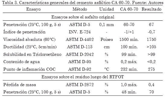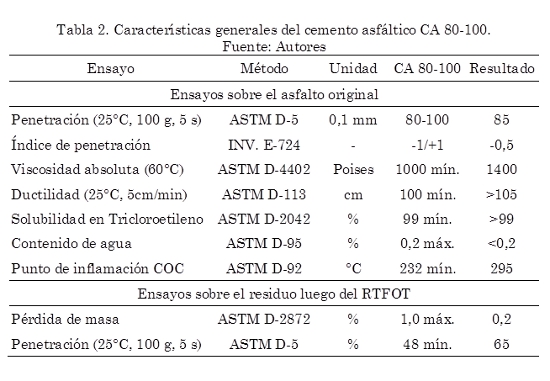 En la Tabla 1 se presentan los valores obtenidos de los ensayos de caracterización al agregado pétreo. Se observa en esta tabla que los valores de cada uno de los ensayos cumplen con el requisito mínimo de calidad exigido por las especificaciones INVIAS (2007a) para fabricar mezclas tipo MDC-2. Para cumplir con las especificaciones del INVIAS (2007a), se modificó la granulometría original de los agregados, tomando como referencia los valores promedios en porcentajes de la franja granulométrica que exige la especificación para la elaboración de las mezclas tipo MDC-2. A los cementos asfálticos se les realizaron los ensayos típicos que exige la especificación INVIAS (2007a) para caracterizarlos y los resultados se presentan en las Tabla 2 y 3. El policloruro de vinilo (PVC) utilizado es un desecho obtenido de la producción de resinas prime de PVC, presenta una densidad de 0,9 g/cm3 y partículas de coloración blanca que pasan el tamiz No. 200 en un ensayo de granulometría cuando el material está en estado seco.