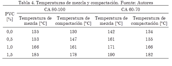 Una vez se obtuvo el porcentaje óptimo de CA, se fabricaron nuevas briquetas agregando por vía húmeda el PVC en porcentajes de 0,5; 1,0 y 1,5% (con respecto al peso total de la briqueta de 1200 g), manteniendo el porcentaje de CA. Por cada porcentaje de aditivo se fabricaron cinco briquetas para ensayarlas en el aparato Marshall con el fin de evaluar la respuesta que experimentan las mezclas bajo carga monotónica en tracción indirecta. Además se realizó el mismo estudio aumentando y rebajando el porcentaje óptimo de CA en 0,3%. La temperatura de mezclado del CA con el PVC fue de 155°C. Esta temperatura fue escogida debido a que por encima de la misma el CA experimenta envejecimiento por pérdida de componentes químicos por oxidación, y por debajo, el mezclado se dificulta especialmente cuando el contenido de PVC es alto. El tiempo de mezclado del CA con el PVC fue de 45 minutos para porcentajes de adición de PVC de 0,5 y 1,0% y de una hora para 1,5%. Esta temperatura y tiempos de mezcla son similares a aquellos reportados por otros investigadores cuando han modificado CA con aditivos plastoméricos (Fang et al., 2008). Con el fin de determinar las temperaturas de mezcla y compactación para la fabricación de las mezclas fueron ejecutados ensayos de viscosidad sobre los ligantes modificados (Tabla 4).
