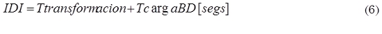 Indicador de duración proceso de integración (IDI): Mide el tiempo que se tarda en desarrollar las actividades de transformación y carga de registros a la bodega de datos, como se muestra en (6).