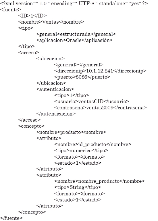 Los agentes recolectores son los responsables del acceso y extracción de los datos en una fuente de origen específica. Este agente debe ser dotado de un conocimiento de dicha fuente que le permitirá tanto acceder a ella, como también capturar únicamente los datos que sean relevantes. Tal conocimiento es encapsulado dentro de un XML, tal como se presenta a manera de ejemplo a continuación.