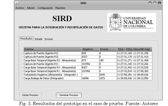 Finalmente, para calcular el sexto (Indicador de duración proceso de integración) se calcula primero el valor de la duración total de las operaciones de transformación aplicadas a los registros para su posterior almacenamiento en la Bodega. De esta manera, Ttransformacion = 11:27:58,391 - 11:30:09,636 = 131,245 s. Luego se calcula la duración de la actividad de cargar de registros a la Bodega: TcargaBD = 11:30:09,636 - 11:30:13,556 = 3,920 s. Con los que se obtiene que, según (6), IDI = 131,245 + 3,920 = 135,165 s.