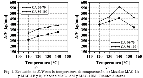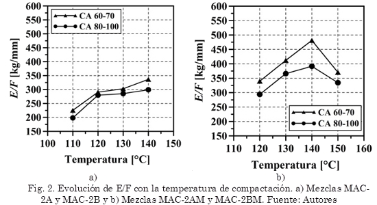 En las Fig. 1 y 2 se presentan la evolución de la relación Estabilidad – Flujo (E/F), con la temperatura de compactación de las muestras convencionales y modificadas. Las Fig. 1a) y 1b) esquematizan los resultados para las mezclas MAC-1A, MAC-1B y MAC-1AM, MAC-1BM respectivamente, y las Fig. 2a) y 2b) los resultados para las mezclas MAC-2A, MAC-2B y MAC-2AM, MAC-2BM respectivamente. Se observa que las mezclas con la granulometría tipo 1, tanto convencionales como modificadas, experimentan una mayor rigidez, entre 10% y 25% superior, en comparación con aquellas fabricadas con la gradación tipo 2. Lo anterior debido a que en esta granulometría (tipo 1), el agregado pétreo presenta mayor tamaño de partículas gruesas. Adicionalmente, se observa un incremento en la relación E/F cuando se utiliza el asfalto modificado con Gcr para fabricar las mezclas, debido principalmente al incremento en viscosidad que experimenta el ligante modificado con la adición del Gcr.