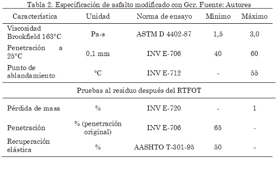Actualmente, Colombia cuenta con las especificaciones del Instituto Nacional de Vías – INVIAS (2007), para la caracterización de cementos asfálticos (CA) modificados. Dentro de la clasificación general se cuentan con cinco tipos de CA modificado: el tipo I utiliza como modificador polímeros del tipo Etileno Vinil Acetato (EVA) o Polietileno, y se recomienda su utilización para la fabricación de mezclas drenantes. Los tipos II, III y IV utilizan copolímeros del tipo estirénico como modificadores, tales como el Estireno-Butadieno-Estireno (SBS). El tipo II se recomienda para la fabricación de mezclas drenantes y de concreto asfáltico; el tipo III se recomienda para la fabricación de mezclas discontinuas y de concreto asfáltico en zonas de alta exigencia, y el tipo IV para la fabricación de mezclas antirreflectivas como las del tipo arena-asfalto. El tipo V es un CA modificado para la elaboración de mezclas de alto módulo. Para el caso de la ciudad de Bogotá D.C., se cuenta con una especificación para la Aplicación de Grano de Caucho Reciclado (Gcr) en mezclas asfálticas en caliente (vía húmeda), según Resolución No. 3841 del 5 de septiembre de 2011 (Instituto de Desarrollo Urbano – IDU y Alcaldía Mayor de Bogotá D.C., 2011). En dicha especificación se describen los objetivos, alcances, tipos de materiales, condiciones para el recibo de los trabajos, la forma de producción del asfalto-caucho y la forma de medida y pagos entre otros aspectos. Para hacer un resumen de los aspectos más importantes de la especificación, en las Tablas 1 a 3 se presentan los intervalos recomendados para realizar la modificación del cemento asfáltico con el Gcr, los requisitos mínimos de calidad que debe cumplir el asfalto-caucho y las mezclas fabricadas con este ligante. Dichas especificaciones, son producto principalmente de estudios realizados en laboratorio y pista de prueba a escala real (carrusel de fatiga) por el IDU & la Universidad de Los Andes (2002, 2005).