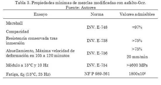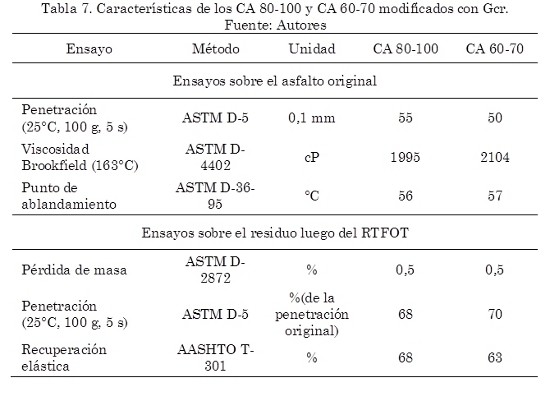 Una vez se obtuvo el porcentaje óptimo de CA, se adicionó a este por vía húmeda el Gcr en porcentajes de 13% y 15% con respecto al peso total de los asfaltos CA 60-70 y CA 80-100 respectivamente. Por vía húmeda se entiende que el aditivo (el Gcr en este caso), se adiciona a alta temperatura al CA y no al agregado pétreo. Estos porcentajes fueron escogidos con base en los estudios reportados por el IDU y la Universidad de Los Andes (2002, 2005), en donde se modificaron y caracterizaron, desde el punto de vista físico, químico y reológico, los asfaltos mencionados por vía húmeda. Es importante resaltar que estos estudios fueron la base sobre la cual fue redactada la Resolución No. 3841 del IDU (2011). La temperatura y el tiempo de reacción de mezcla de los asfaltos con el Gcr fueron de 165°C y 55 minutos respectivamente. Con el fin de verificar el criterio CALTRANS (viscosidad entre 1500 cp y 3000 cp) para la escogencia del porcentaje de adición de Gcr, se ejecutaron ensayos de viscosidad a 163°C medidos en un viscosímetro rotacional. En la Tabla 7 se presentan los ensayos realizados sobre los asfaltos modificados y se observa que cumplen con los requisitos mínimos de calidad que especifica la Resolución No. 3841 del IDU (2011) (ver Tabla 2).