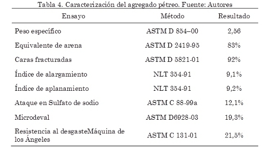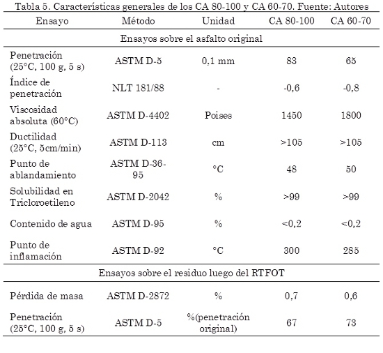 En la Tabla 4 se presentan los valores obtenidos de los ensayos de caracterización al agregado pétreo. Se observa en esta tabla, que los valores de cada uno de los ensayos cumplen con el requisito mínimo de calidad exigido por las especificaciones del Instituto Nacional de Vías - INVIAS (2007) y del Instituto de Desarrollo Urbano – IDU (2005), para fabricar mezclas de concreto asfáltico. A los cementos asfálticos CA 60-70 y CA 80-100, se les realizaron los ensayos que exige la especificación INVIAS (2007) e IDU (2005) para caracterizarlos y los resultados se presentan en la Tabla 5. El grano de caucho reciclado de llanta (Gcr) proviene de la empresa MUNDOLIMPIO. Este material presenta partículas de coloración negra que pasan el tamiz No. 40 en un ensayo de granulometría por tamizado.