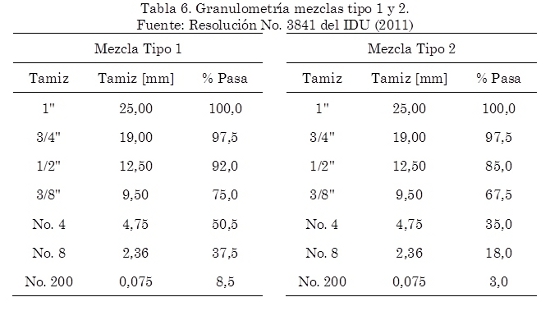 Las granulometrías utilizadas para la fabricación de las mezclas asfálticas en caliente convencionales (sin aditivo), se presentan en la Tabla 6. Estas dos granulometrías son acordes con las estipuladas en la Resolución No. 3841 del IDU (2011). Para cumplir con las granulometrías especificadas en dicha Resolución, se modificó la composición original de los agregados pétreos, tomando como referencia los valores promedios en porcentaje de la franja granulométrica, que exige la especificación para la elaboración de las mezclas tipo 1 y 2 (ver Tabla 6).