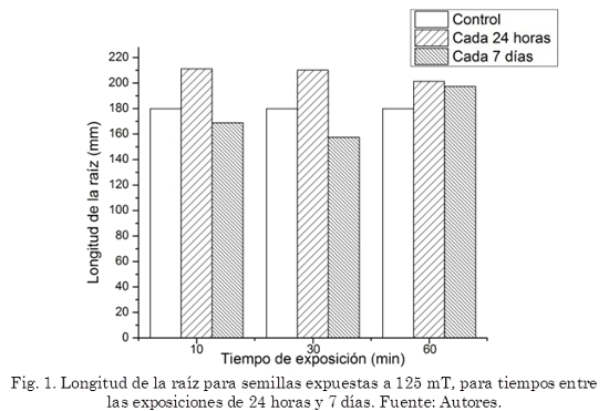 Respecto a la longitud de la raíz, se encontró que la densidad de flujo magnético tiene un efecto significativo, y se halló una interacción entre los factores utilizados. En términos generales el grupo de 30 mT mostró diferencias significativas en relación al grupo de control. Tras realizar comparaciones múltiples se halló que solamente se diferencia el grupo de 250 mT/30 min con una longitud promedio de 35,98 mm, respecto al grupo de control (143,53 mm), en este caso la influencia del tratamiento magnético es una fuerte disminución de la variable medida, catalogándose como un efecto negativo de la dosis utilizada.