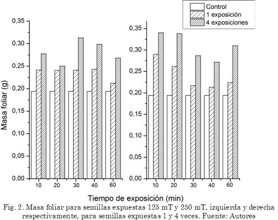La masa foliar presentó diferencias significativas entre los grupos que fueron expuestos cuatro veces y los de una sola exposición, además, se encontraron diferencias comparando la masa del grupo control (0,19 g) y los grupos expuestos 125mT/10min y 250mT/10min con cuatro exposiciones magnéticas (0,28 y 0,34 g) respectivamente (ver Fig. 2). En este experimento la masa foliar se muestra dependiente de las veces que las semillas fueron expuestas, debido a que se logró una mejora para 4 exposiciones con respecto a los otros grupos, lo cual indica que este factor se debe tomar en cuenta para futuras investigaciones.