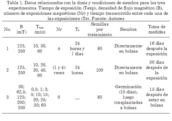Las semillas de leucaena fueron suministradas por Semicol Ltda. (Bogotá, Colombia), quienes aseguran uniformidad en sus características. La siembra se realizó inmediatamente terminado el tratamiento magnético. El proceso de germinación y crecimiento de las plántulas se efectuó en el vivero de la Universidad Tecnológica de Pereira en condiciones de invernadero, con temperatura y fotoperiodo natural; el riego se estableció por agotamiento de agua en el suelo (cada dos días), suministrando la misma cantidad a cada una de las plántulas. Para todos los experimentos factoriales se usó un grupo de semillas sin exposición magnética como control. La evolución de los valores para los factores utilizados se refinó con cada experimento como se expone en la Tabla 1, para la prueba 3.