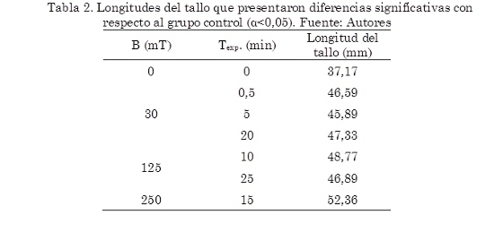 Para la longitud del tallo únicamente los grupos definidos por el factor inducción magnética tuvieron longitudes medias diferentes, también se presenta un efecto de interacción entre los factores campo magnético y tiempo de exposición. En promedio los grupos que mostraron diferencias significativas con respecto al grupo control fueron 30, 62,5, 125 y 250 mT. En la Tabla 2 se muestran los grupos para los cuales las longitudes del tallo presentaron diferencias respecto al grupo de control.