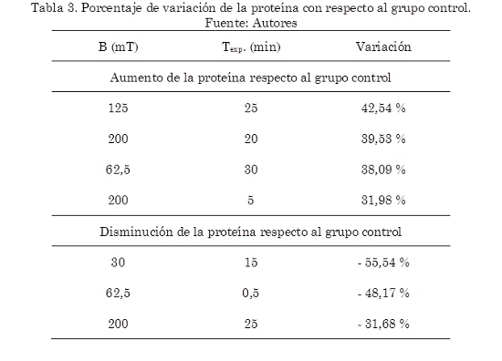 Para el comportamiento de las variaciones en el porcentaje de proteína, no se ha encontrado una dependencia lineal entre los factores de exposición y la respuesta encontrada, lo que sugiere que se puede presentar un fenómeno similar a lo expuesto por Funk et al. (2010), que plantea que la exposición a campo magnético AC, presenta «ventanas de frecuencia», fenómenos en los cuales se da una mayor estimulación, aunque las densidades de flujo magnético sean bajas.