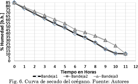 El tiempo de deshidratado del orégano es de 11 horas para este prototipo, comparado con el secador solar de la Fundación San Gabriel ubicada en el corregimiento de Santa Elena, Antioquia, este demora 72 horas de secado. La norma técnica colombiana NTC4423 que es la norma para condimentos y especias, especifica que la humedad para el orégano deshidratado es del 15%, lo cual valida el deshidratado en el prototipo en el cual se alcanzó la humedad del 10%, en las primeras dos bandejas en un tiempo de 10 horas, la correspondiente a la norma ISO 7925:1999, la tercer bandeja alcanzó la humedad del 10% en un tiempo de 11 horas.