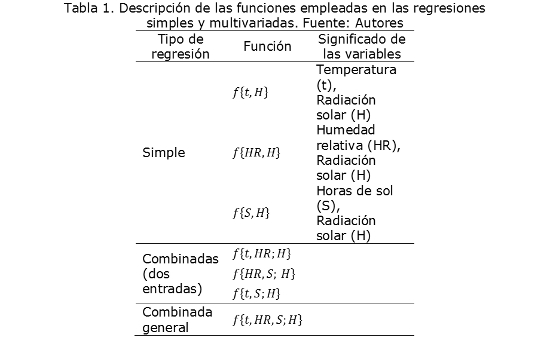 Finalmente, para la estimación del modelo estadístico que represente en mejor ajuste para los datos se establecieron tres diseños, teniendo en cuenta lo planteado por Benghanem et al. [27]. El primer grupo corresponde a regresiones simples entre cada una de las variables alternas y la radiación solar, el segundo grupo de diseño que se abordó lo establecen regresiones multivariadas entre un par de los parámetros alternos y la radiación solar. Finalmente, el tercer diseño lo conforma una regresión multivariada de todos los parámetros alternos y la radiación solar medida. En general se obtuvieron un total de siete regresiones (Tabla 1). El modelo de regresión que presente la mejor predicción será aquel que presente estadísticamente un mejor coeficiente de correlación (R2) y un menor Error Absoluto Medio (MAE).