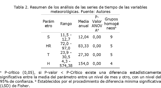 Los datos muestran que las horas de sol fluctúan en un rango no muy amplio de duración comprendidos entre 11,45 y 12,65 horas, así mismo se observa que los meses centrales del año presentan una mayor duración de las horas de sol (ver Fig. 1a). Igualmente, los datos presentan una baja dispersión mensual (datos recolectados del mismo mes), esto se puede atribuir al hecho de que la zona de estudio se encuentra en una zona cercana al ecuador y de poca altitud, presentando poca variación estacional de las horas del sol a lo largo del mes o el año. En cuanto al ANOVA de las horas de sol, se ratifica lo planteado anteriormente, puesto que se observa la mayor conformación de grupos homogéneos de todos los parámetros estudiados (Tabla 2), debido a la poca variación intrínseca de los datos en un mismo mes.