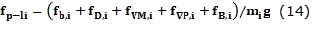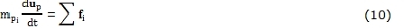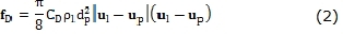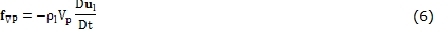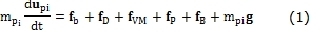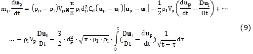 En la ecuación (1) la fuerza total sobre una partícula se compone de una fuerza de cuerpo externa conocida (gravedad, mig), las fuerzas de interacción sólido-líquido (fb y fD) y las fuerzas inerciales (fVM, fP y fB). En la ecuación (1) mpi, upi, fb, fD, fVM, fP, fB son la masa de la partícula, la velocidad de la partícula, la fuerza de empuje, la fuerza de arrastre, la fuerza de masa virtual, la fuerza debida al gradiente de presión y la fuerza de Basset, respectivamente.